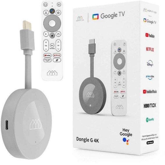 Homatics Dongle G 4K to przystawka Android SMART TV 4K na systemie oficjalnym Android 11 z WiFi 2,4G / 5G, pamięcią RAM 2GB i flash 8GB, w kompaktowej obudowie chowanej za TV.