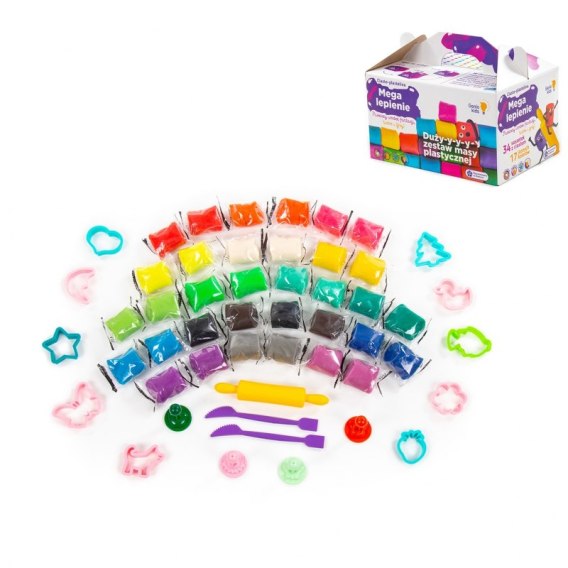 Duży zestaw masy plastycznej Mega Lepienie to świetny pomysł na zabawę na długie godziny dla naszej pociechy. W zestawie znajdziemy 34 saszetki z masą plastyczną łącznie 17 kolorów oraz 17 akcesoriów do modelowania. Twórz, baw się i fantazjuj z mega zestawem ciastoliny sam bądź z całą rodziną. Masa plastyczna nie brudzi rąk. Dodatkowo na pudełku informacja jakie kolory można złączyć aby wyszło coś zupełnie nowego. Zestaw jest zapakowany w kartonowym pudełku które jest łatwe w transporcie za pomocą rączki do trzymania , którą sami składamy(instrukcja na pudełku). Zabawa masą plastyczną ćwiczy motorykę dziecka, wyobraźnie, zdolności manualne i kreatywne.